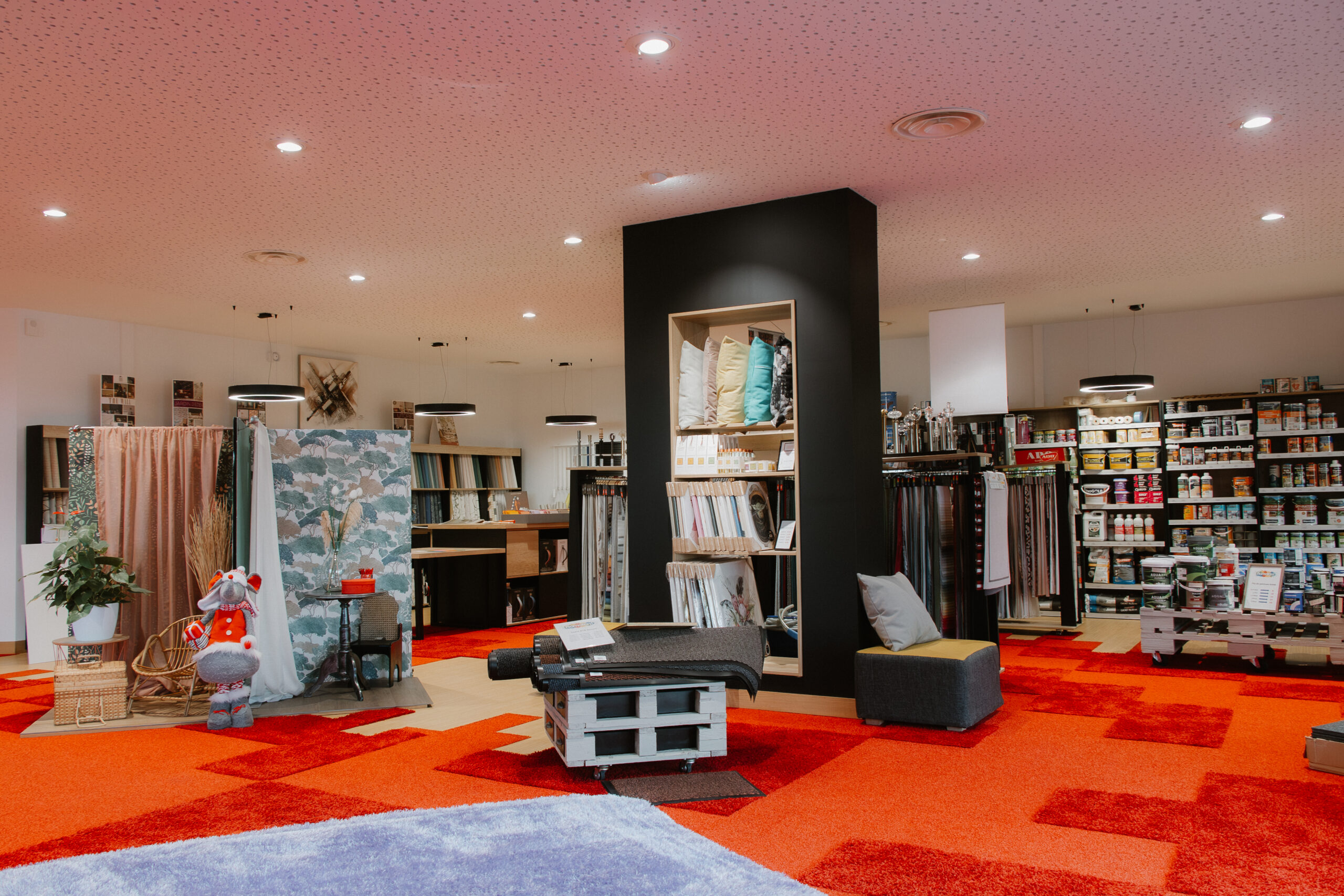 Un large choix de papiers peints, des peintures professionnelles, des sols de qualités, des stores et des rideaux sur mesures.